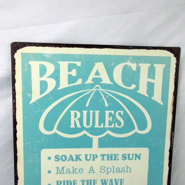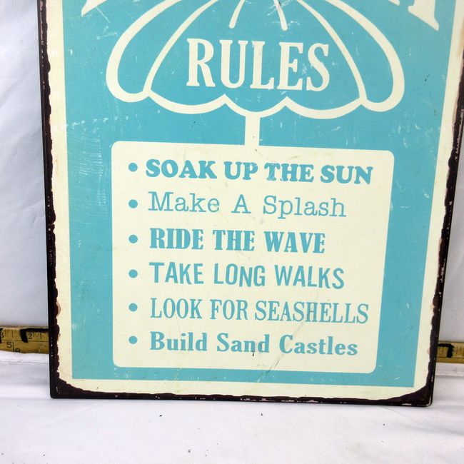 Current Bid: $11.00 [Refresh Price]YOU WILL NEED TO REFRESH THIS PAGE TO SEE UPDATED BID (Log in and this will update automatically) You must LOG IN or REGISTER to see this full page auction listing and bid. Auction is Over Winning Bid Amount: $11.00 **Lot Details: (85i) - BEACH RULES turquoise metal Sign, 15 1/2" high x 12" wide Log in to add this lot to your watch list or place a bid |