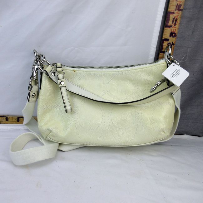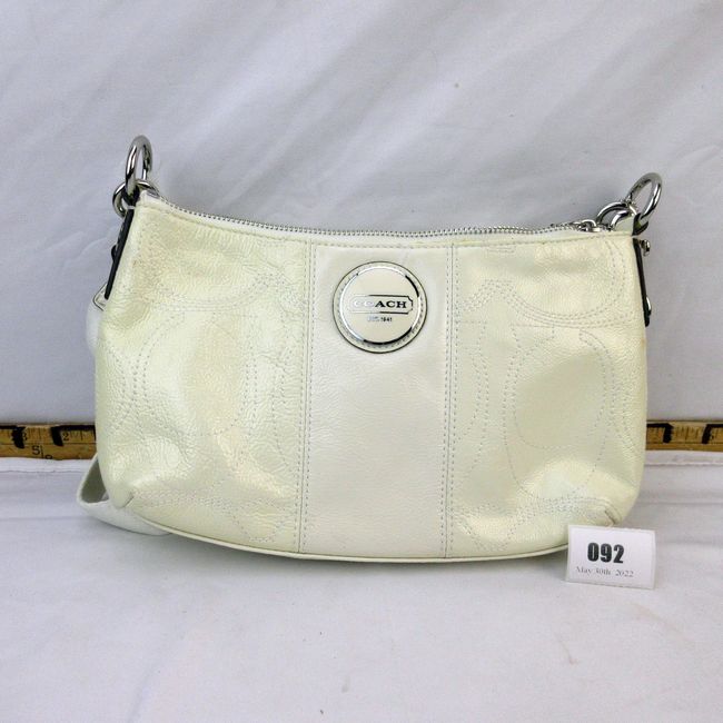 Current Bid: $17.00 [Refresh Price]YOU WILL NEED TO REFRESH THIS PAGE TO SEE UPDATED BID (Log in and this will update automatically) You must LOG IN or REGISTER to see this full page auction listing and bid. Auction is Over Winning Bid Amount: $17.00 **Lot Details: (92i) - New w tags Coach patent leather cream Handbag Shoulder Bag and had a couple of orange marks around zipper area from manufacturing hard to notice but there, never used comes with patent Coach leather care card Log in to add this lot to your watch list or place a bid |