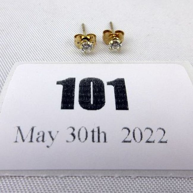 Current Bid: $45.00 [Refresh Price]YOU WILL NEED TO REFRESH THIS PAGE TO SEE UPDATED BID (Log in and this will update automatically) You must LOG IN or REGISTER to see this full page auction listing and bid. Auction is Over Winning Bid Amount: $45.00 **Lot Details: (101i) - 14K GOLD Earrings with 14K Gold Backings and untested stones Log in to add this lot to your watch list or place a bid |