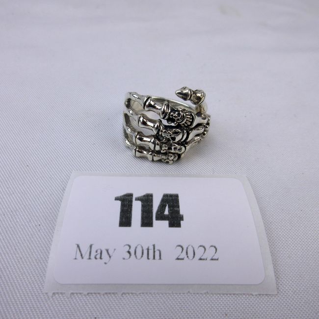 Current Bid: $56.00 [Refresh Price]YOU WILL NEED TO REFRESH THIS PAGE TO SEE UPDATED BID (Log in and this will update automatically) You must LOG IN or REGISTER to see this full page auction listing and bid. Auction is Over Winning Bid Amount: $56.00 **Lot Details: (114i) - Sterling Silver 5 Finger Skeleton Head Ring very detailed Log in to add this lot to your watch list or place a bid |