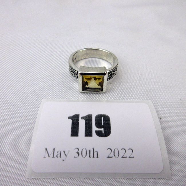 Current Bid: $23.00 [Refresh Price]YOU WILL NEED TO REFRESH THIS PAGE TO SEE UPDATED BID (Log in and this will update automatically) You must LOG IN or REGISTER to see this full page auction listing and bid. Auction is Over Winning Bid Amount: $23.00 **Lot Details: (119i) - Signed SHA Sterling Silver Amber faceted stone w Marcasite sides Ring Log in to add this lot to your watch list or place a bid |