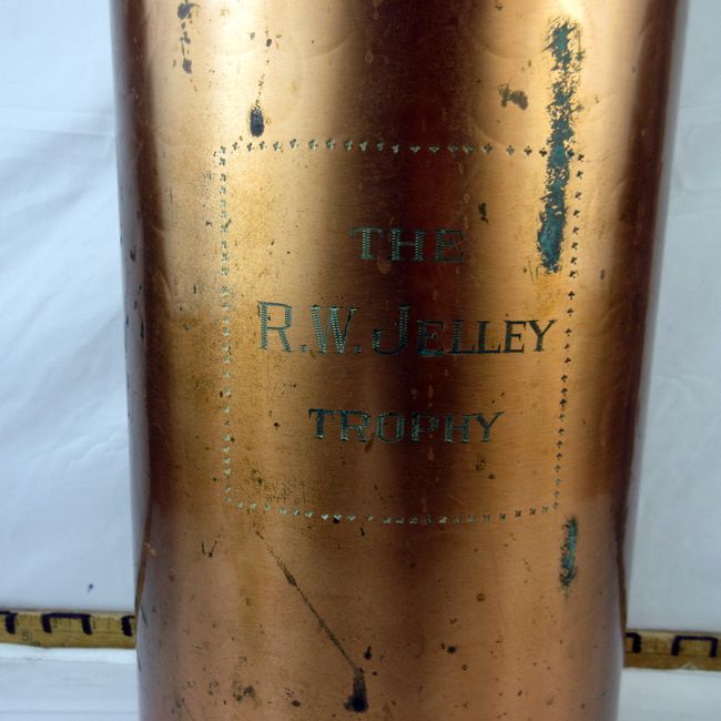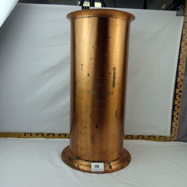 Current Bid: $20.00 [Refresh Price]YOU WILL NEED TO REFRESH THIS PAGE TO SEE UPDATED BID (Log in and this will update automatically) You must LOG IN or REGISTER to see this full page auction listing and bid. Auction is Over Winning Bid Amount: $20.00 **Lot Details: (178i) - Vintage copper cylinder container. Hand wrought in Canada by the company Fantasy. 20"H, 8 lbs. the RW Jelley Trophy engraved on side Log in to add this lot to your watch list or place a bid |