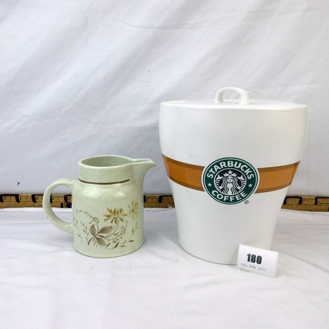 Current Bid: $14.01 [Refresh Price]YOU WILL NEED TO REFRESH THIS PAGE TO SEE UPDATED BID (Log in and this will update automatically) You must LOG IN or REGISTER to see this full page auction listing and bid. Auction is Over Winning Bid Amount: $14.01 **Lot Details: (180i) - Starbucks coffee bean/cookie jar canister in excellent condition with lid and vintage 1977 Royal Doulton Sandsprite creamer Log in to add this lot to your watch list or place a bid |