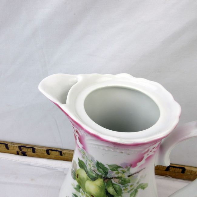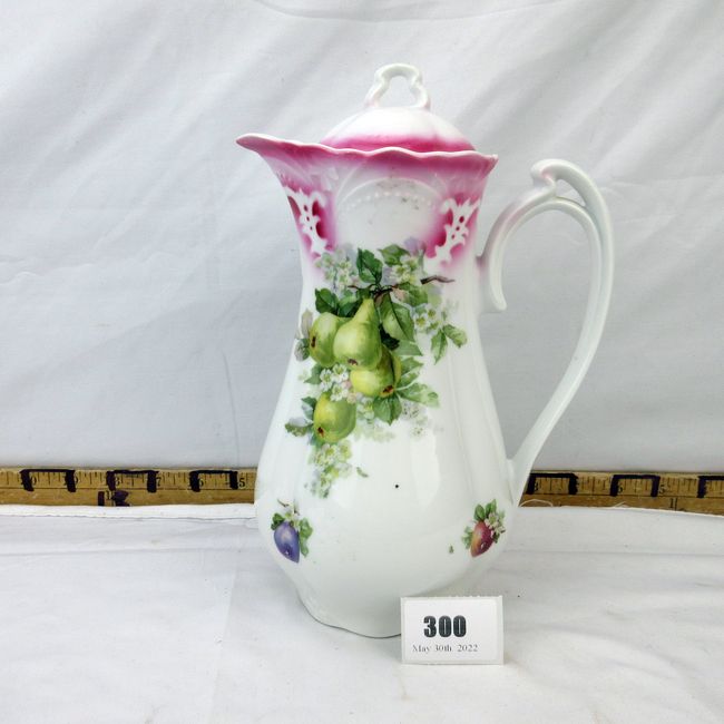 Current Bid: $8.00 [Refresh Price]YOU WILL NEED TO REFRESH THIS PAGE TO SEE UPDATED BID (Log in and this will update automatically) You must LOG IN or REGISTER to see this full page auction listing and bid. Auction is Over Winning Bid Amount: $8.00 **Lot Details: (300i) - Cocoa pot with Art Nouveau shaped handle, has summer fruit/pears motif. Difficult to determine back stamp however it looks like a tripe crown, Austria. No chips, cracks. 10 1/4"H x 7"W spout to handle Log in to add this lot to your watch list or place a bid |