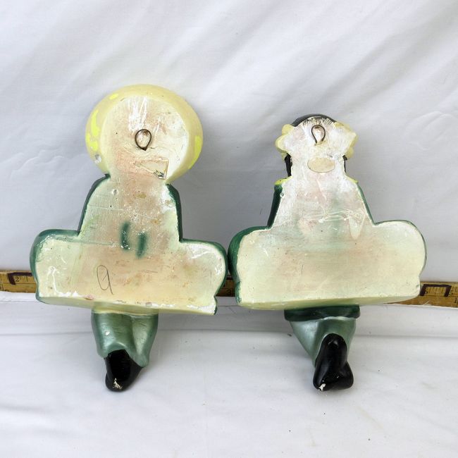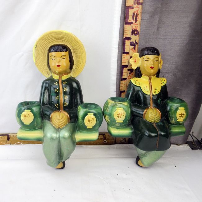 Current Bid: $9.00 [Refresh Price]YOU WILL NEED TO REFRESH THIS PAGE TO SEE UPDATED BID (Log in and this will update automatically) You must LOG IN or REGISTER to see this full page auction listing and bid. Auction is Over Winning Bid Amount: $9.00 **Lot Details: (305i) - Pair of vintage MCM/mid century modern chalkware figures, male and female. Oriental motif, 10 1/2"H x 6 1/2"W. Wire loop hangers on the back of each figure, ready to hang Log in to add this lot to your watch list or place a bid |