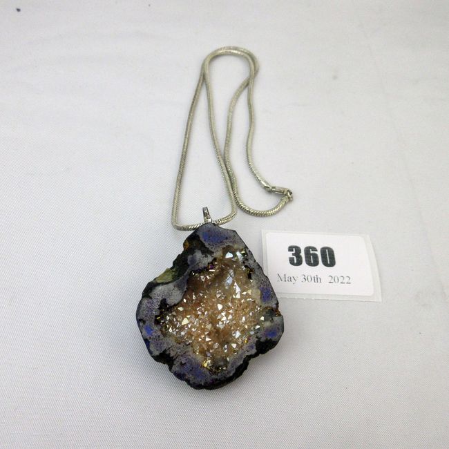 Current Bid: $18.75 [Refresh Price]YOU WILL NEED TO REFRESH THIS PAGE TO SEE UPDATED BID (Log in and this will update automatically) You must LOG IN or REGISTER to see this full page auction listing and bid. Auction is Over Winning Bid Amount: $18.75 **Lot Details: (360i) - Absolutely stunning crystal geode 2" pendant. Comes on large untested 18" silver necklace. Log in to add this lot to your watch list or place a bid |