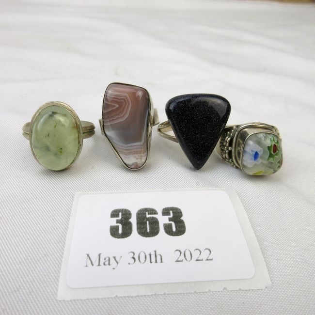 Current Bid: $46.00 [Refresh Price]YOU WILL NEED TO REFRESH THIS PAGE TO SEE UPDATED BID (Log in and this will update automatically) You must LOG IN or REGISTER to see this full page auction listing and bid. Auction is Over Winning Bid Amount: $46.00 **Lot Details: (363i) - Lot of 4 Artisan silver rings with glass & stone inserts. All marked but untested. Log in to add this lot to your watch list or place a bid |
