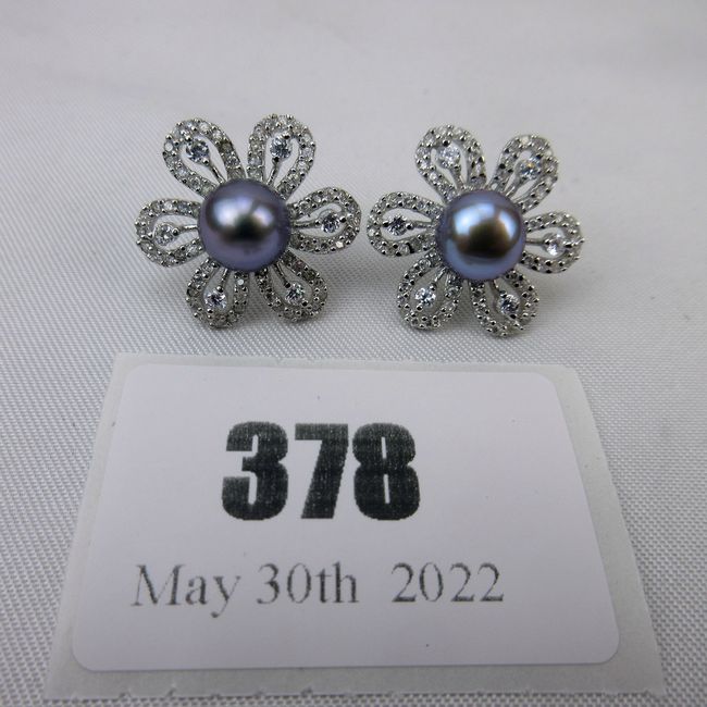 Current Bid: $33.03 [Refresh Price]YOU WILL NEED TO REFRESH THIS PAGE TO SEE UPDATED BID (Log in and this will update automatically) You must LOG IN or REGISTER to see this full page auction listing and bid. Auction is Over Winning Bid Amount: $33.03 **Lot Details: (378i) - A beautiful pair of flower pedal shaped earrings with a large black pearls and iced out faceted stones. These sparkle for miles. Marked sterling silver Log in to add this lot to your watch list or place a bid |