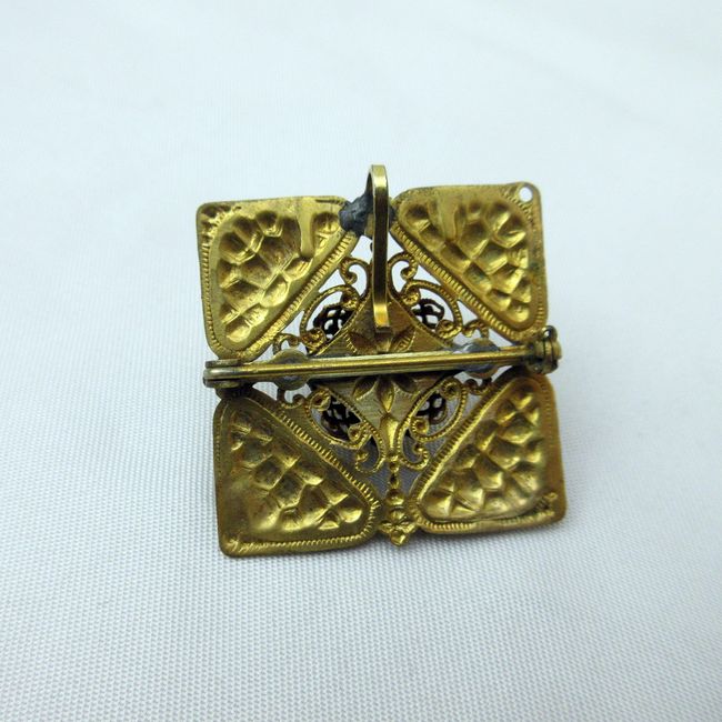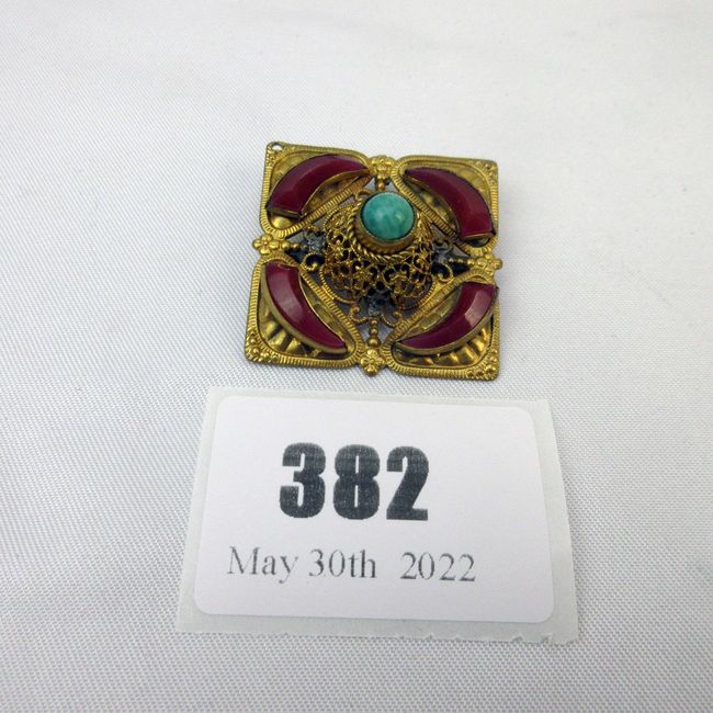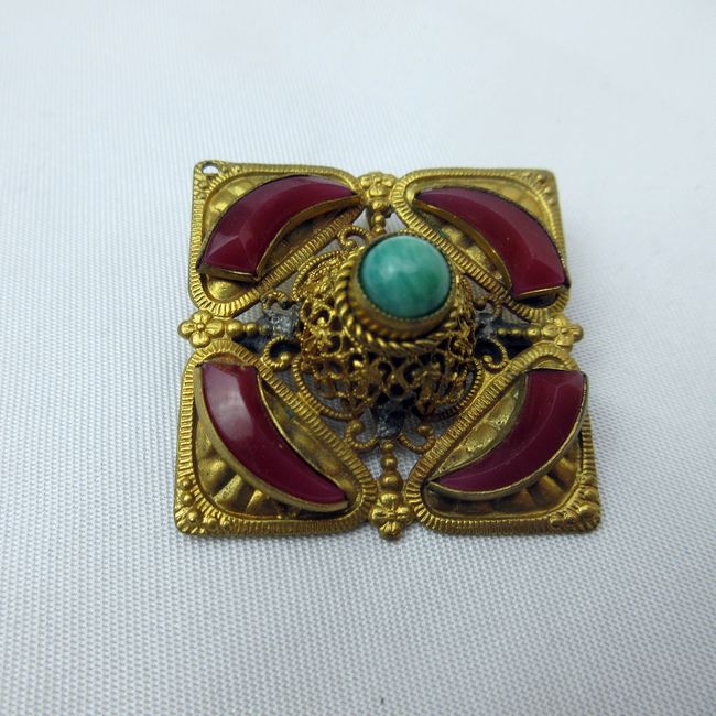 Current Bid: $11.00 [Refresh Price]YOU WILL NEED TO REFRESH THIS PAGE TO SEE UPDATED BID (Log in and this will update automatically) You must LOG IN or REGISTER to see this full page auction listing and bid. Auction is Over Winning Bid Amount: $11.00 **Lot Details: (382i) - A very old top quality filigree brooch with inlaid red carnelian and turquoise stones. Style seems to point to early 1800s European. Unmarked but not uncommon for the period Log in to add this lot to your watch list or place a bid |