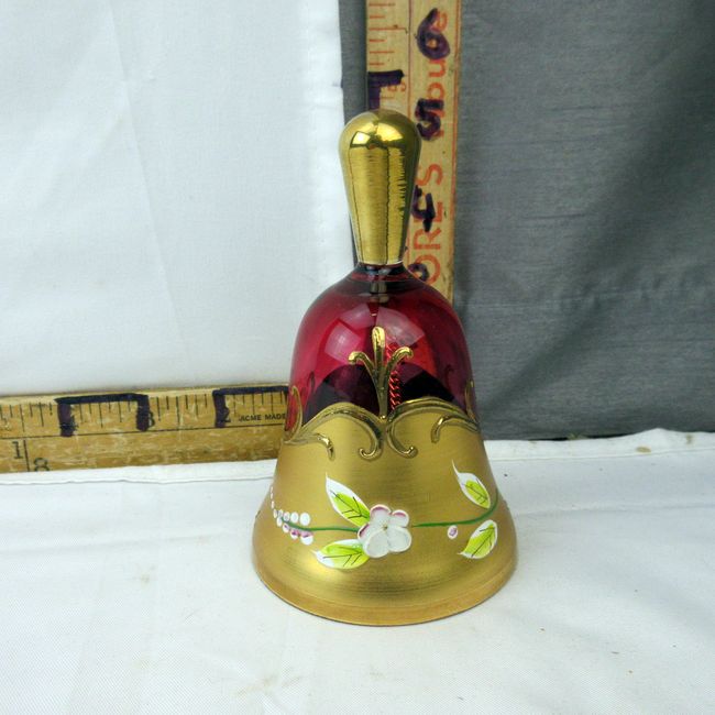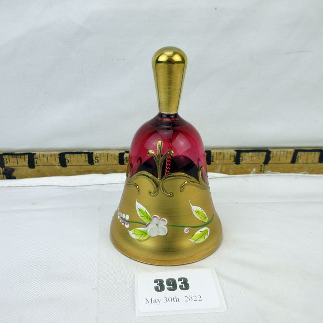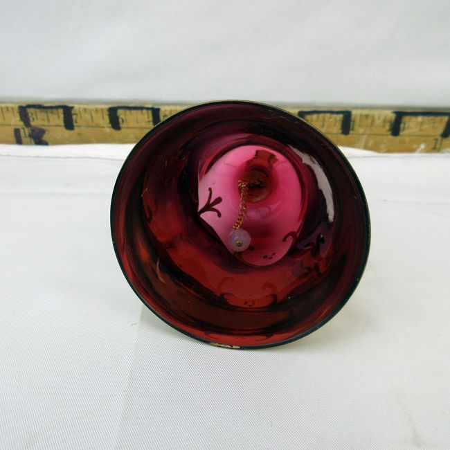 Current Bid: $11.08 [Refresh Price]YOU WILL NEED TO REFRESH THIS PAGE TO SEE UPDATED BID (Log in and this will update automatically) You must LOG IN or REGISTER to see this full page auction listing and bid. Auction is Over Winning Bid Amount: $11.08 **Lot Details: (393i) - An antique hand painted enamel and cranberry glass bell. Dripping in gold. A fine cranberry piece Log in to add this lot to your watch list or place a bid |