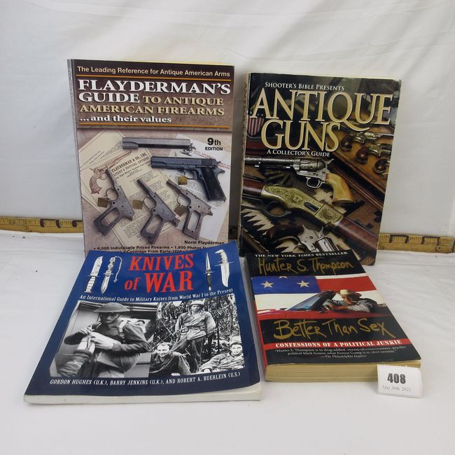 Current Bid: $5.00 [Refresh Price]YOU WILL NEED TO REFRESH THIS PAGE TO SEE UPDATED BID (Log in and this will update automatically) You must LOG IN or REGISTER to see this full page auction listing and bid. Auction is Over Winning Bid Amount: $5.00 **Lot Details: (408i) - 4 books. Playderman's Guide to Antique American Firearms. Large format Shooter's Bible to Antique Guns. Also large format Knives of War Guide and Better Than Sex, Hunter S Thompson Log in to add this lot to your watch list or place a bid |