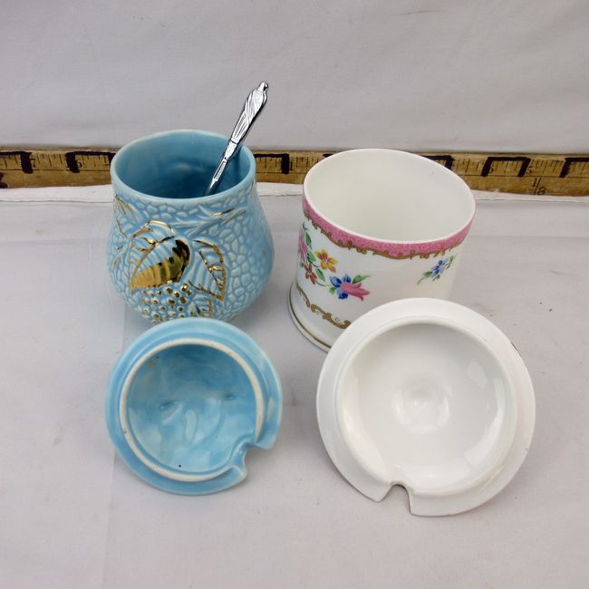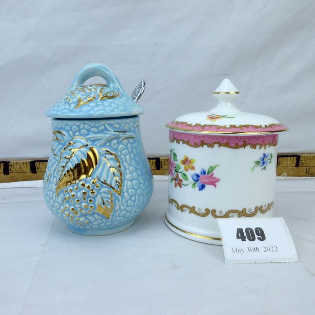 Current Bid: $7.00 [Refresh Price]YOU WILL NEED TO REFRESH THIS PAGE TO SEE UPDATED BID (Log in and this will update automatically) You must LOG IN or REGISTER to see this full page auction listing and bid. Auction is Over Winning Bid Amount: $7.00 **Lot Details: (409i) - Pretty Staffordshire floral jam pot, lidded 4 1/2"H x 3 1/4" diam. blue and gold Wade jam pot with Apostle spoon. 4 1/2" x 3" diam Log in to add this lot to your watch list or place a bid |