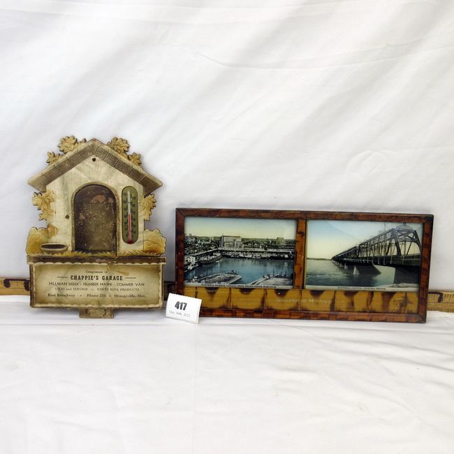 Current Bid: $[Refresh Price]YOU WILL NEED TO REFRESH THIS PAGE TO SEE UPDATED BID (Log in and this will update automatically) You must LOG IN or REGISTER to see this full page auction listing and bid. Auction is Over Winning Bid Amount: $This item did not sell **Lot Details: (417i) - Vintage Montreal souvenir framed and concave glass postcard 12" x 5". 8 1/2" x 6 1/4" vintage calendar top, Chappies Garage Orangeville thermometer Log in to add this lot to your watch list or place a bid |