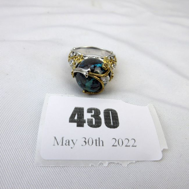 Current Bid: $22.22 [Refresh Price]YOU WILL NEED TO REFRESH THIS PAGE TO SEE UPDATED BID (Log in and this will update automatically) You must LOG IN or REGISTER to see this full page auction listing and bid. Auction is Over Winning Bid Amount: $22.22 **Lot Details: (430i) - Stunning large Chrysocolla 925 silver ring. Gorgeous detail, stone about the size of a marble. This is a show piece! Very good condition Log in to add this lot to your watch list or place a bid |