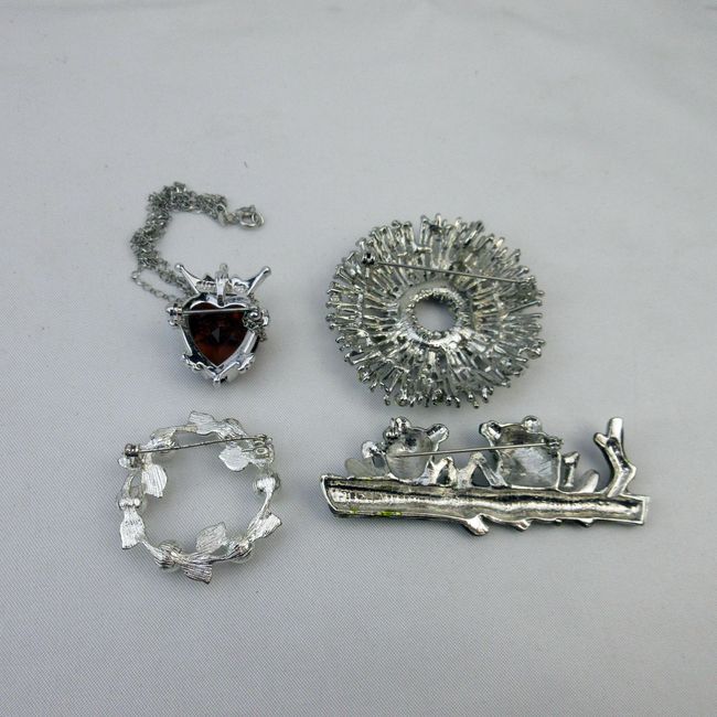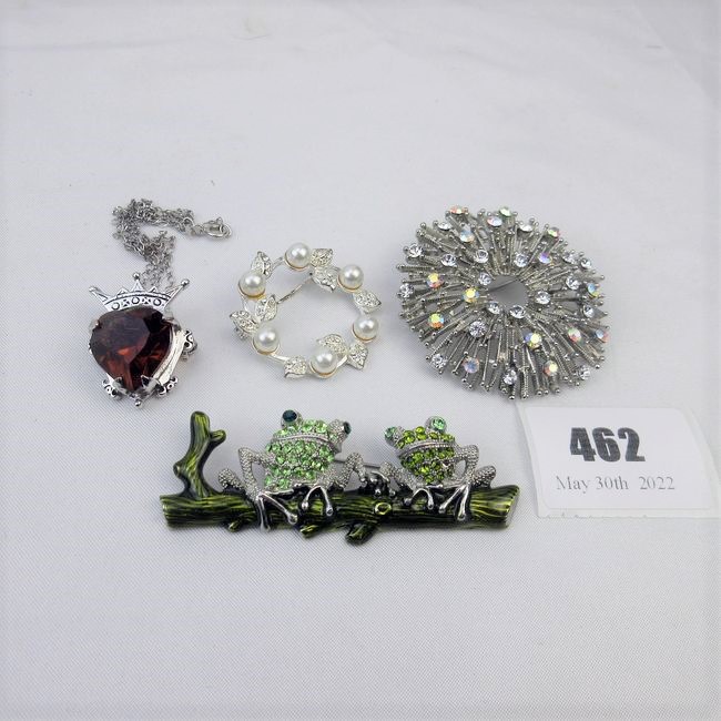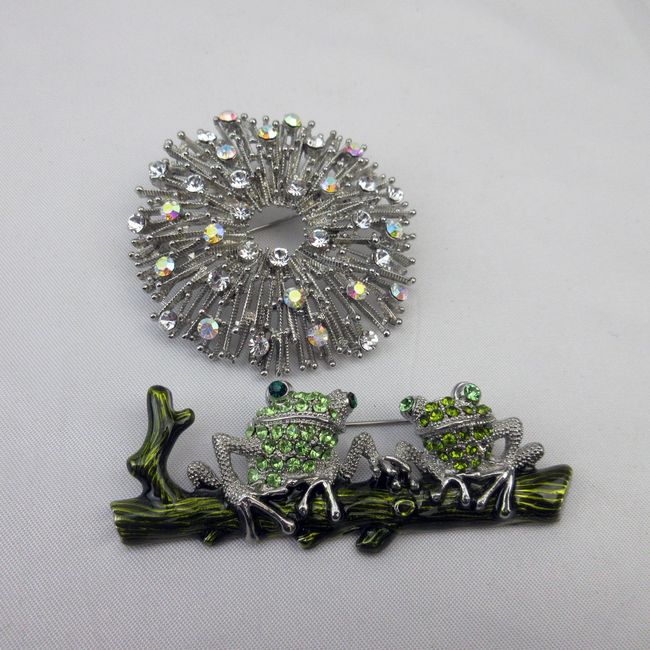 Current Bid: $18.01 [Refresh Price]YOU WILL NEED TO REFRESH THIS PAGE TO SEE UPDATED BID (Log in and this will update automatically) You must LOG IN or REGISTER to see this full page auction listing and bid. Auction is Over Winning Bid Amount: $18.01 **Lot Details: (462i) - Large round sparkly piece, can be worn as necklace or brooch. Fun brooch, 2 Frogs on a branch, silver necklace or brooch, topaz stone with crown. Lovely silver brooch, circle with pearls Log in to add this lot to your watch list or place a bid |