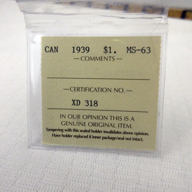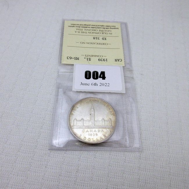Current Bid: $34.01 [Refresh Price]YOU WILL NEED TO REFRESH THIS PAGE TO SEE UPDATED BID (Log in and this will update automatically) You must LOG IN or REGISTER to see this full page auction listing and bid. Auction is Over Winning Bid Amount: $34.01 **Lot Details: (4j) - Canada 1939 Silver Dollar, ICCS certified MS-63. Canada's first commemorative Silver Dollar, proudly depicts the Parliament Buildings in Ottawa Log in to add this lot to your watch list or place a bid |