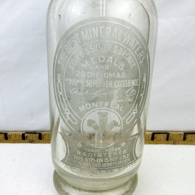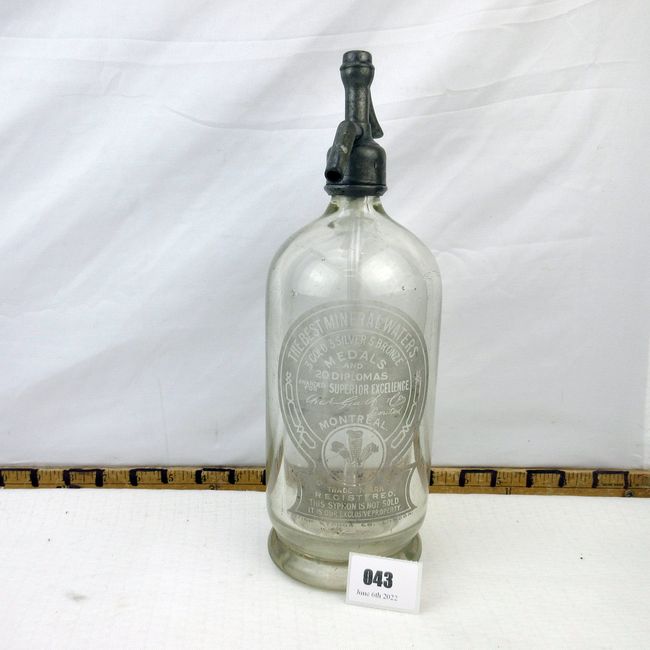 Current Bid: $52.00 [Refresh Price]YOU WILL NEED TO REFRESH THIS PAGE TO SEE UPDATED BID (Log in and this will update automatically) You must LOG IN or REGISTER to see this full page auction listing and bid. Auction is Over Winning Bid Amount: $52.00 **Lot Details: (43j) - 1930's Ich Dien mineral water bottle with lead top syphon. Lovely frosted glass label markings and syphon engraved. Heavy glass. Rare. Montreal Log in to add this lot to your watch list or place a bid |