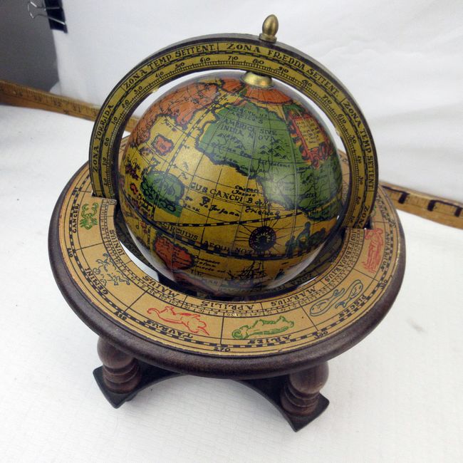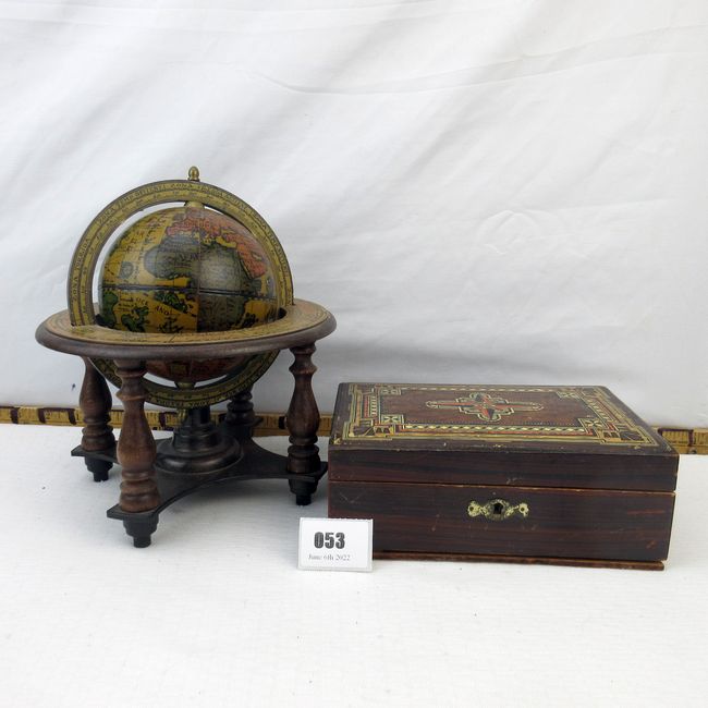 Current Bid: $11.00 [Refresh Price]YOU WILL NEED TO REFRESH THIS PAGE TO SEE UPDATED BID (Log in and this will update automatically) You must LOG IN or REGISTER to see this full page auction listing and bid. Auction is Over Winning Bid Amount: $11.00 **Lot Details: (53j) - Cool vintage combo. Wood framed sitting globe with brass fixture hardware. Also, wooden hinged 2 tier box with complimentary graphics to the globe. Some scuffs but nice looking still Log in to add this lot to your watch list or place a bid |