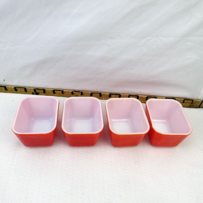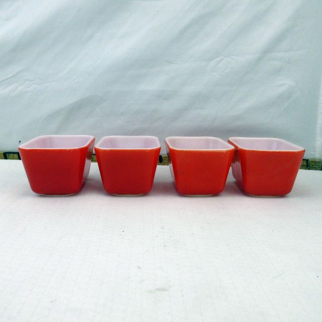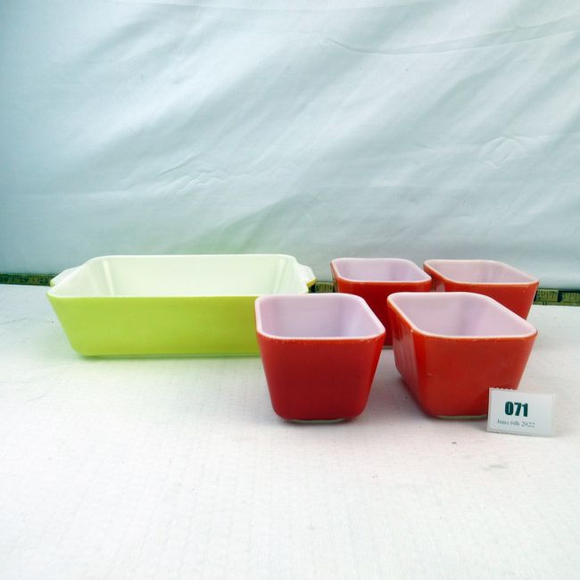 Current Bid: $18.00 [Refresh Price]YOU WILL NEED TO REFRESH THIS PAGE TO SEE UPDATED BID (Log in and this will update automatically) You must LOG IN or REGISTER to see this full page auction listing and bid. Auction is Over Winning Bid Amount: $18.00 **Lot Details: (71j) - 5 pcs Vintage Pyrex, 4 Red Baking/Prep/Condominet Dishes #501 and Yellow Casserole Baking Pan #503 on the very bottom white ridge has a small knick hard to see does not affect base and all are in bright colourful condition Log in to add this lot to your watch list or place a bid |