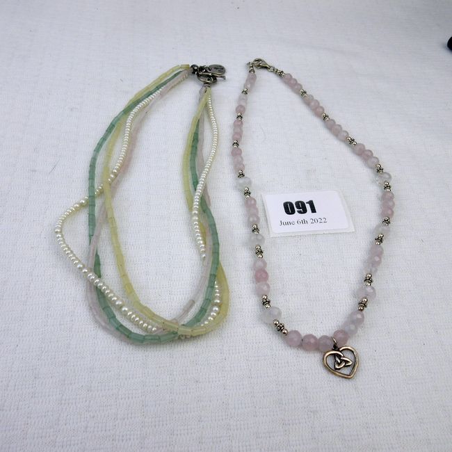 Current Bid: $5.00 [Refresh Price]YOU WILL NEED TO REFRESH THIS PAGE TO SEE UPDATED BID (Log in and this will update automatically) You must LOG IN or REGISTER to see this full page auction listing and bid. Auction is Over Winning Bid Amount: $5.00 **Lot Details: (91j) - Two Sterling Silver Necklaces, faceted celtic pinkish stone 18" And 4 strung Pearl and stone Sterling Necklace with a funky toggle closure Log in to add this lot to your watch list or place a bid |