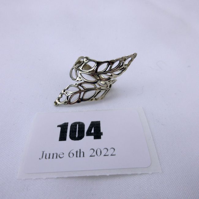 Current Bid: $22.00 [Refresh Price]YOU WILL NEED TO REFRESH THIS PAGE TO SEE UPDATED BID (Log in and this will update automatically) You must LOG IN or REGISTER to see this full page auction listing and bid. Auction is Over Winning Bid Amount: $22.00 **Lot Details: (104j) - Large Leaf open cut Sterling Silver Ring Log in to add this lot to your watch list or place a bid |