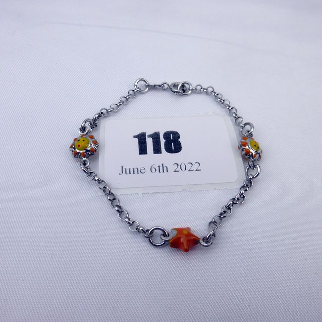 Current Bid: $5.00 [Refresh Price]YOU WILL NEED TO REFRESH THIS PAGE TO SEE UPDATED BID (Log in and this will update automatically) You must LOG IN or REGISTER to see this full page auction listing and bid. Auction is Over Winning Bid Amount: $5.00 **Lot Details: (118j) - A vintage sterling silver bracelet from Italy with enamelled suns and star. A nice colourful piece! Log in to add this lot to your watch list or place a bid |