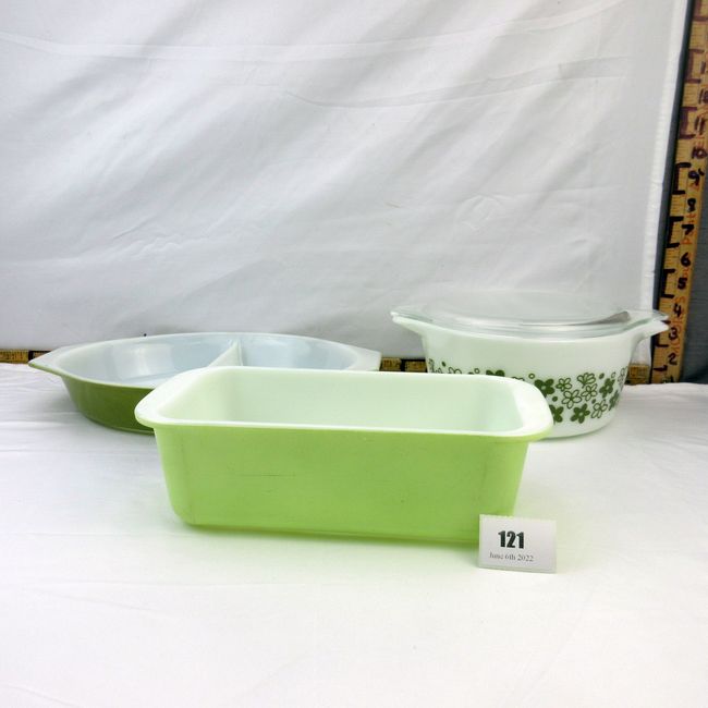 Current Bid: $38.00 [Refresh Price]YOU WILL NEED TO REFRESH THIS PAGE TO SEE UPDATED BID (Log in and this will update automatically) You must LOG IN or REGISTER to see this full page auction listing and bid. Auction is Over Winning Bid Amount: $38.00 **Lot Details: (121j) - A very nice lot of vintage Pyrex, the crazy daisy casserole dish has a lid. All are in very good condition, never seen a dishwasher. Log in to add this lot to your watch list or place a bid |
