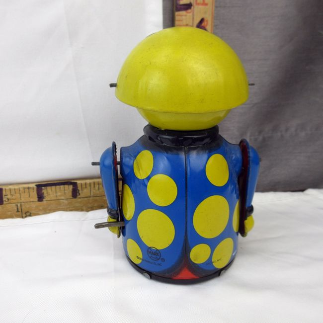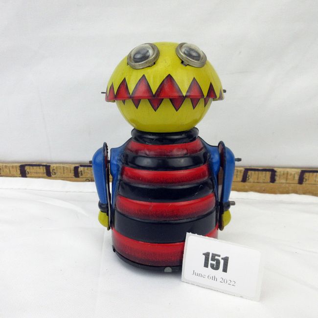 Current Bid: $38.50 [Refresh Price]YOU WILL NEED TO REFRESH THIS PAGE TO SEE UPDATED BID (Log in and this will update automatically) You must LOG IN or REGISTER to see this full page auction listing and bid. Auction is Over Winning Bid Amount: $38.50 **Lot Details: (151j) - A vintaqge tin Marx toys mechanical chompy the beetle moon robot toy. Appears to be missing part of the winding key but can probably be rigged to work again. A great display piece either way Log in to add this lot to your watch list or place a bid |
