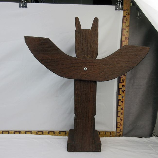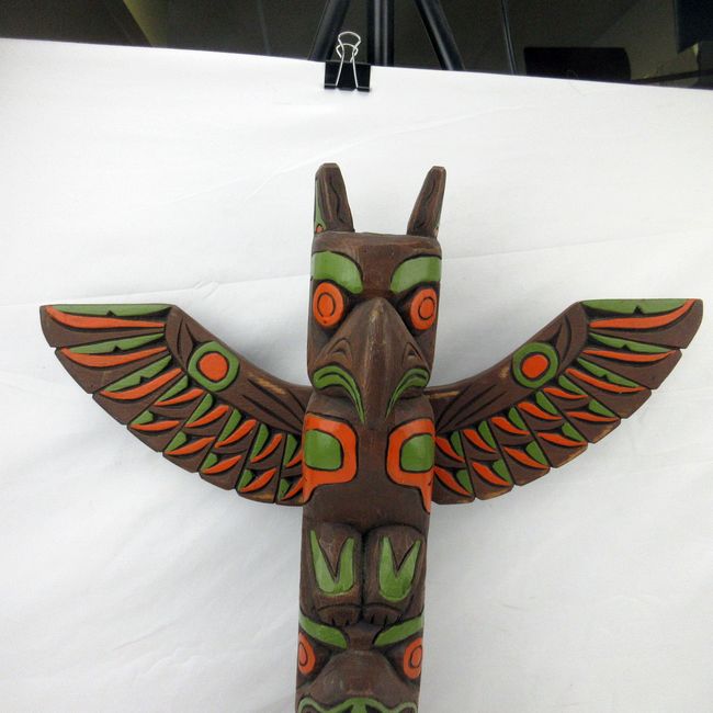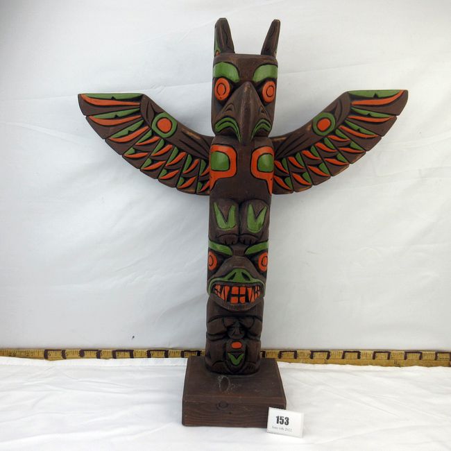 Current Bid: $20.00 [Refresh Price]YOU WILL NEED TO REFRESH THIS PAGE TO SEE UPDATED BID (Log in and this will update automatically) You must LOG IN or REGISTER to see this full page auction listing and bid. Auction is Over Winning Bid Amount: $20.00 **Lot Details: (153j) - A great looking vintage Haida design totem pole from Alaska. Signed on the underside by Kiana of Alaska. Approx 20" tall. Appears to be wood but consignor was unsure as they also make synthetic sculptures. A great looking piece either way Log in to add this lot to your watch list or place a bid |