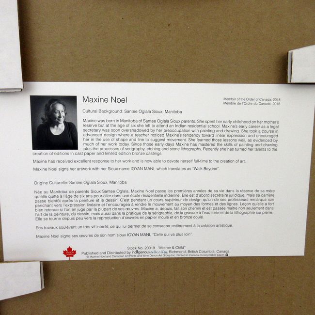 Current Bid: $34.33 [Refresh Price]YOU WILL NEED TO REFRESH THIS PAGE TO SEE UPDATED BID (Log in and this will update automatically) You must LOG IN or REGISTER to see this full page auction listing and bid. Auction is Over Winning Bid Amount: $34.33 **Lot Details: (168j) - Mother and Child authentic artwork by internationally renowned Maxine Noel signs with her Sioux name. Loyan Mani. Matted and framed 12" x 14.5", new Log in to add this lot to your watch list or place a bid |