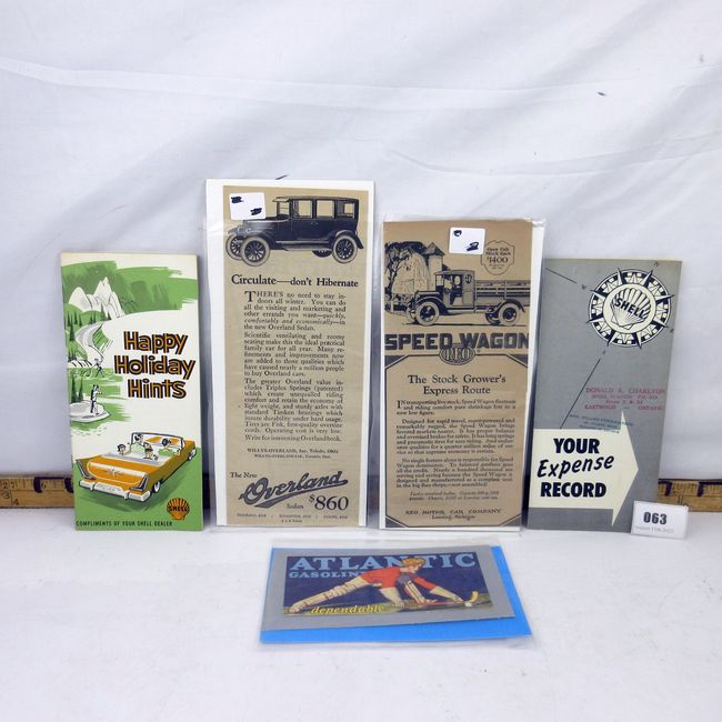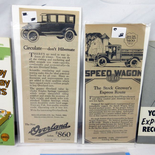 Current Bid: $[Refresh Price]YOU WILL NEED TO REFRESH THIS PAGE TO SEE UPDATED BID (Log in and this will update automatically) You must LOG IN or REGISTER to see this full page auction listing and bid. Auction is Over Winning Bid Amount: $This item did not sell **Lot Details: (63s) - Overland newspaper ad 1923, Reo Speedwagon ad 1922, Atlantic Gasoline ads, Speed and Dependable Shell Holiday Hints ad Expense Record 50's 60's Log in to add this lot to your watch list or place a bid |