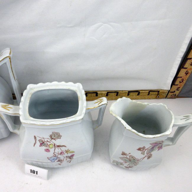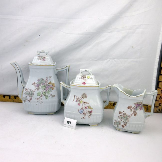 Current Bid: $5.00 [Refresh Price]YOU WILL NEED TO REFRESH THIS PAGE TO SEE UPDATED BID (Log in and this will update automatically) You must LOG IN or REGISTER to see this full page auction listing and bid. Auction is Over Winning Bid Amount: $5.00 **Lot Details: (101s) - 3pc Royal Ironstone, England tea, milk and sugar, slight crack. Clean, nice size. Tea 9"H x 8"L x 4"D, milk 5"H x 5"L x 2.5". Sugar 7"H x 6.5"L x 4.5"D Log in to add this lot to your watch list or place a bid |