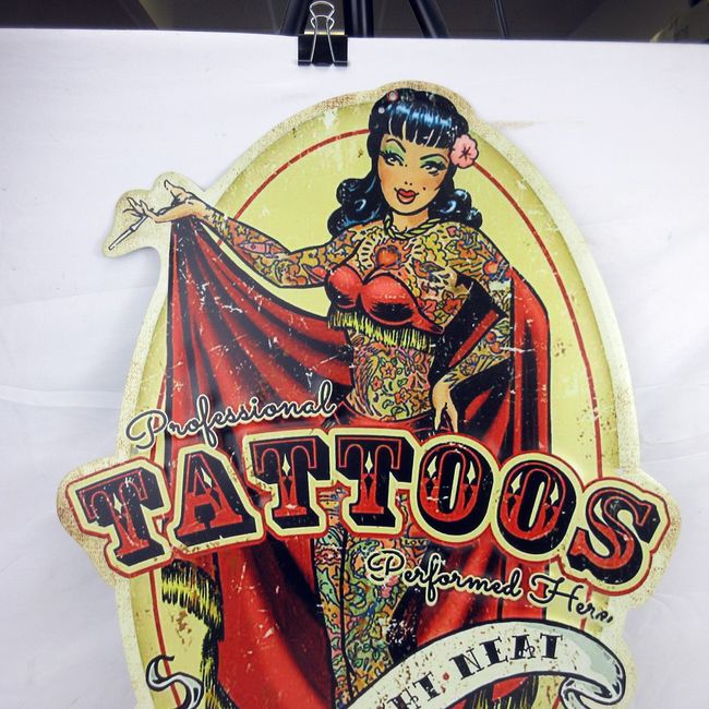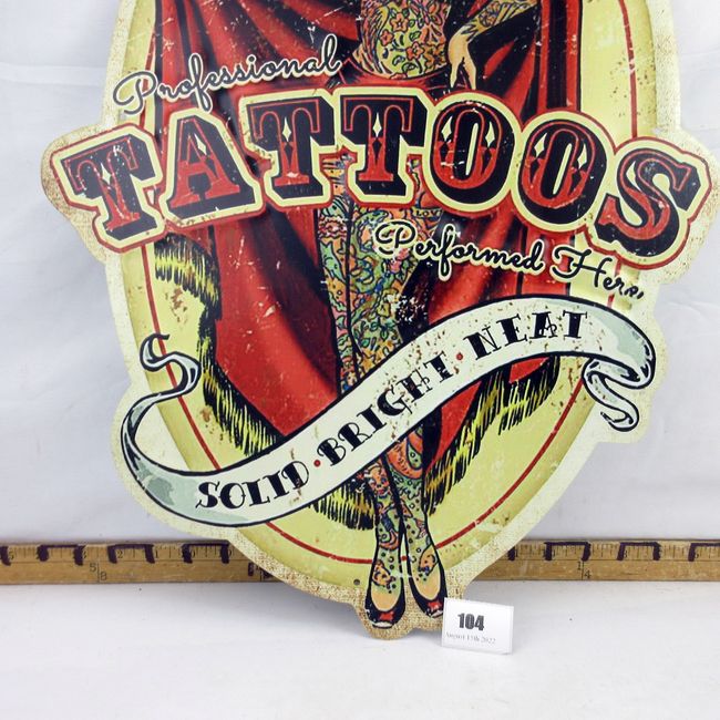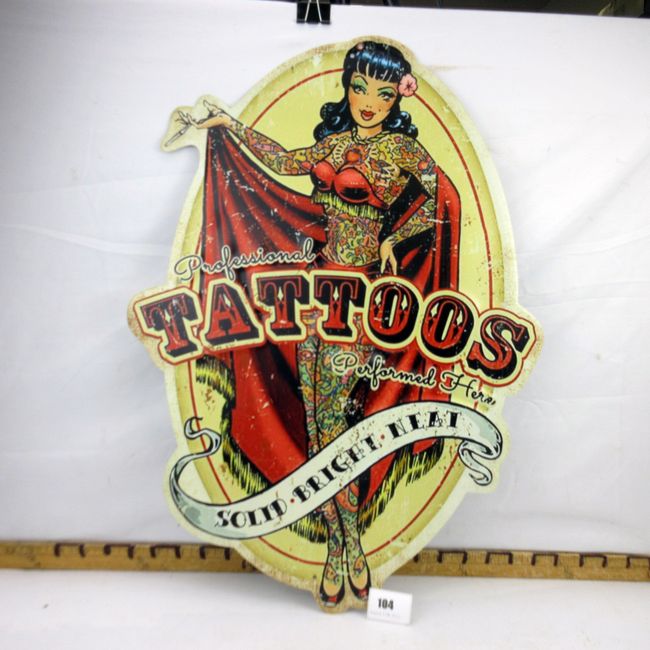 Current Bid: $85.00 [Refresh Price]YOU WILL NEED TO REFRESH THIS PAGE TO SEE UPDATED BID (Log in and this will update automatically) You must LOG IN or REGISTER to see this full page auction listing and bid. Auction is Over Winning Bid Amount: $85.00 **Lot Details: (104s) - Large vintage style Tattoos sign. Great detail and colours, raised letters. 16"W x 22"H Log in to add this lot to your watch list or place a bid |
