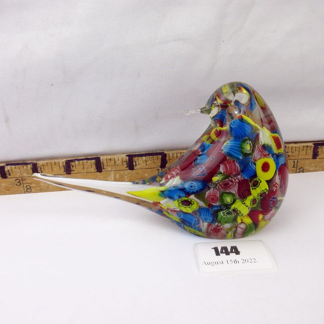 Current Bid: $50.33 [Refresh Price]YOU WILL NEED TO REFRESH THIS PAGE TO SEE UPDATED BID (Log in and this will update automatically) You must LOG IN or REGISTER to see this full page auction listing and bid. Auction is Over Winning Bid Amount: $50.33 **Lot Details: (144s) - A vintage blown glass bird with millefiori cut cane pattern. Very colourful and in great condition. Log in to add this lot to your watch list or place a bid |