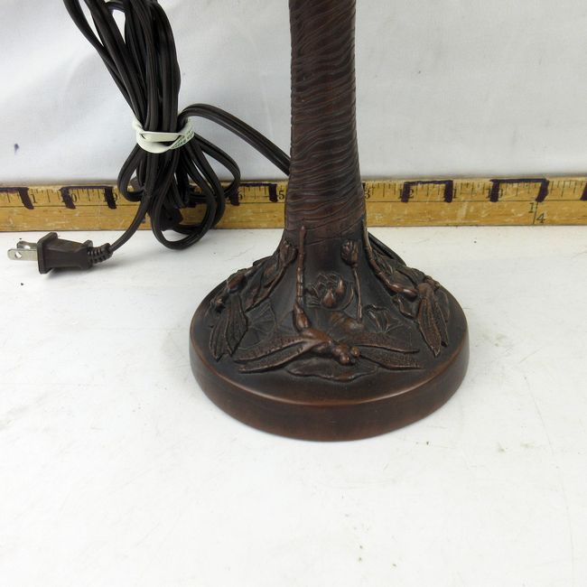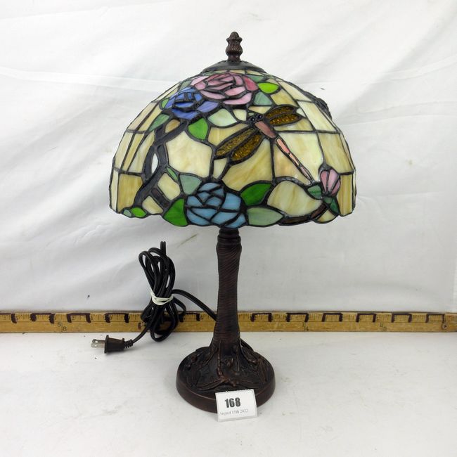 Current Bid: $93.00 [Refresh Price]YOU WILL NEED TO REFRESH THIS PAGE TO SEE UPDATED BID (Log in and this will update automatically) You must LOG IN or REGISTER to see this full page auction listing and bid. Auction is Over Winning Bid Amount: $93.00 **Lot Details: (168s) - An incredible vintage Tiffany style stained glass dragonfly lamp with cast metal raised relief dragonfly base. Even the stained glass flowers on the shade are raised to show depth and texture which is uncommon with these lamps. Log in to add this lot to your watch list or place a bid |