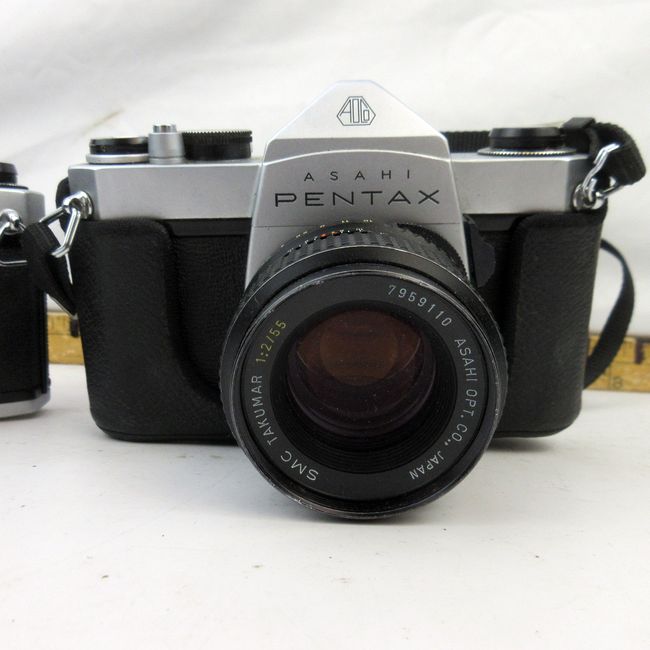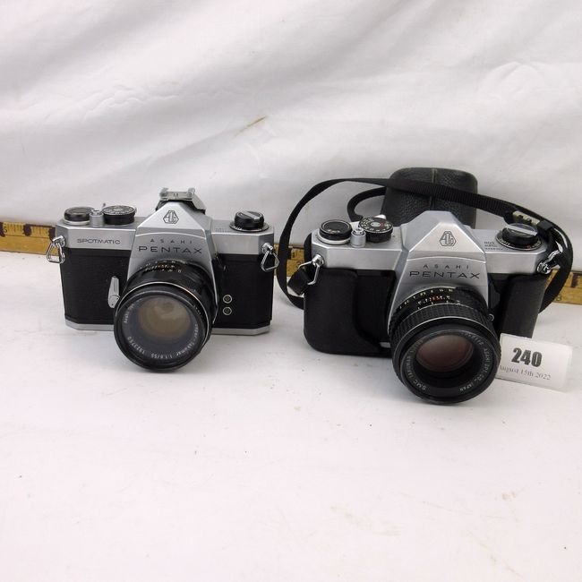 Current Bid: $42.20 [Refresh Price]YOU WILL NEED TO REFRESH THIS PAGE TO SEE UPDATED BID (Log in and this will update automatically) You must LOG IN or REGISTER to see this full page auction listing and bid. Auction is Over Winning Bid Amount: $42.20 **Lot Details: (240s) - Two vintage 35mm Asahi Pentax slr cameras. A Spotmatic and SP 500 with a 1.8 55mm lens and a 1:2 55mm lens. Both cameras work properly. Lenses are fungus and haze free. Blades are oil free. Very nice condition Log in to add this lot to your watch list or place a bid |