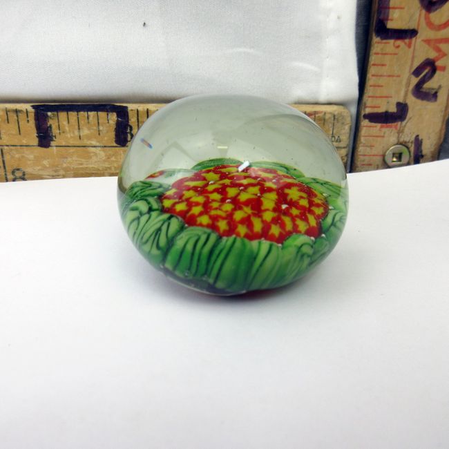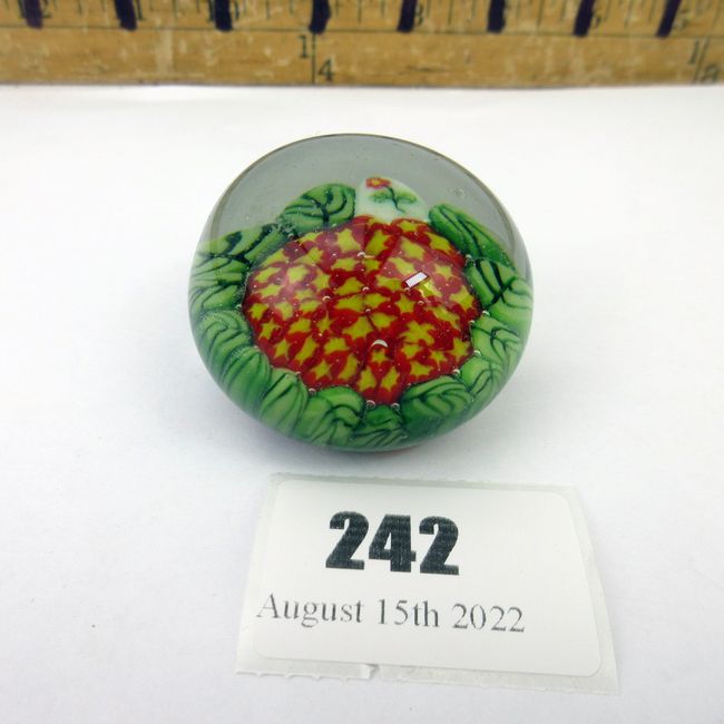 Current Bid: $5.00 [Refresh Price]YOU WILL NEED TO REFRESH THIS PAGE TO SEE UPDATED BID (Log in and this will update automatically) You must LOG IN or REGISTER to see this full page auction listing and bid. Auction is Over Winning Bid Amount: $5.00 **Lot Details: (242s) - A very well made glass paperweight with beautiful cane detail. Single rose cane similar to clichy Log in to add this lot to your watch list or place a bid |