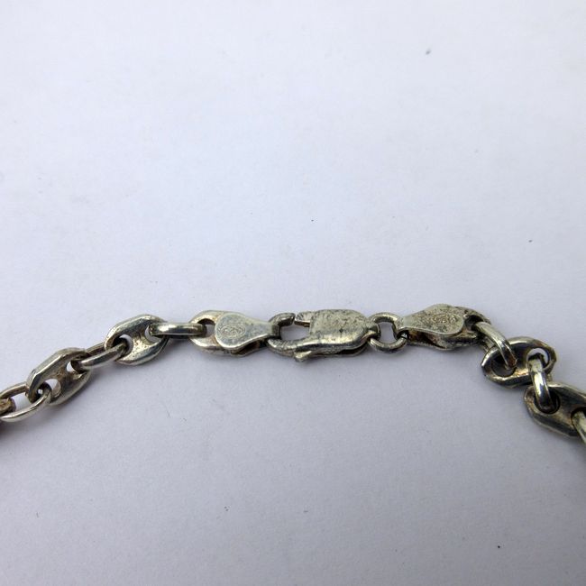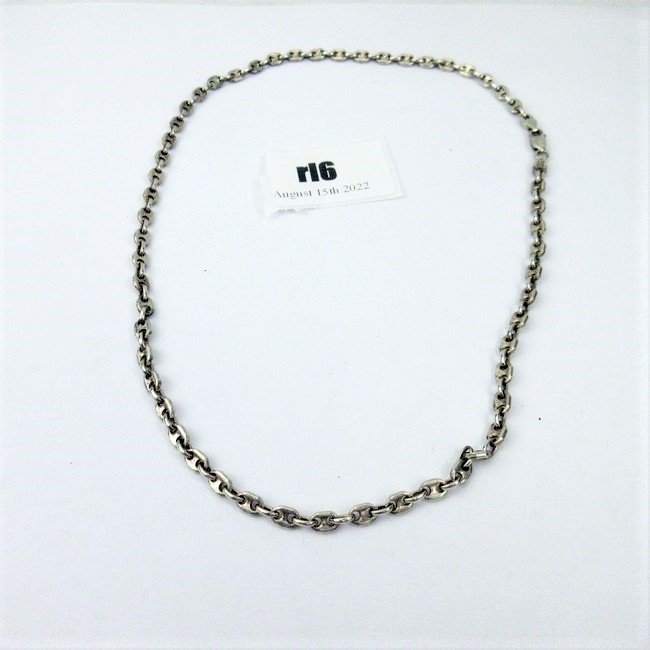 Current Bid: $47.87 [Refresh Price]YOU WILL NEED TO REFRESH THIS PAGE TO SEE UPDATED BID (Log in and this will update automatically) You must LOG IN or REGISTER to see this full page auction listing and bid. Auction is Over Winning Bid Amount: $47.87 **Lot Details: (RL6) - Vintage heavy Men’s Biker sterling silver “Gucci link” chain made in Italy; 19” L Log in to add this lot to your watch list or place a bid |