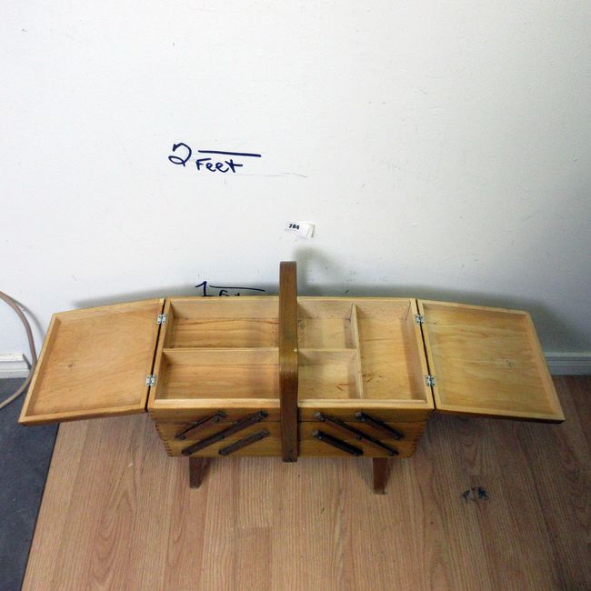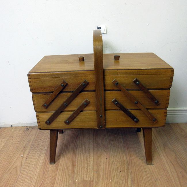 Current Bid: $28.00 [Refresh Price]YOU WILL NEED TO REFRESH THIS PAGE TO SEE UPDATED BID (Log in and this will update automatically) You must LOG IN or REGISTER to see this full page auction listing and bid. Auction is Over Winning Bid Amount: $28.00 **Lot Details: (284s) - A vintage mid century wooden sewing box with accordion drawers and a bent wood handle. Log in to add this lot to your watch list or place a bid |