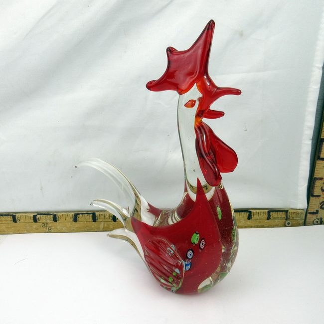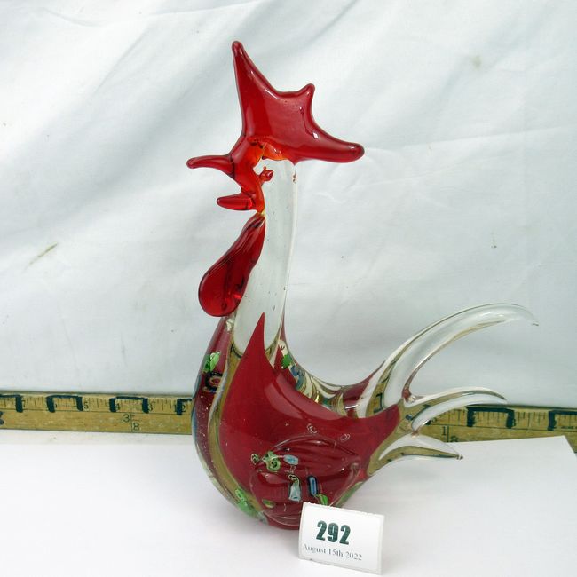 Current Bid: $15.33 [Refresh Price]YOU WILL NEED TO REFRESH THIS PAGE TO SEE UPDATED BID (Log in and this will update automatically) You must LOG IN or REGISTER to see this full page auction listing and bid. Auction is Over Winning Bid Amount: $15.33 **Lot Details: (292s) - A blown glass rooster with cut cane millefiori inclusions. Great colours! Just over 10” tall. Log in to add this lot to your watch list or place a bid |