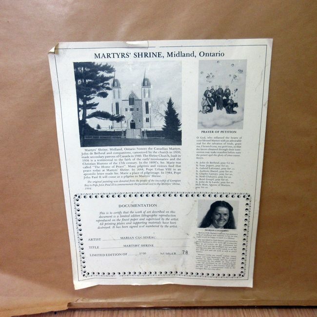 Current Bid: $17.00 [Refresh Price]YOU WILL NEED TO REFRESH THIS PAGE TO SEE UPDATED BID (Log in and this will update automatically) You must LOG IN or REGISTER to see this full page auction listing and bid. Auction is Over Winning Bid Amount: $17.00 **Lot Details: (294s) - A fantastic vintage limited edition print of the Martyrs Shrine in Midland. The original painting was done by talented artist Marian Cousineau and gifted to Pope John Paul II to commemorate the Papal visit in 1984. Nicely framed, matted Log in to add this lot to your watch list or place a bid |