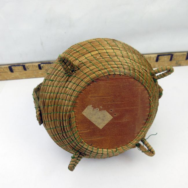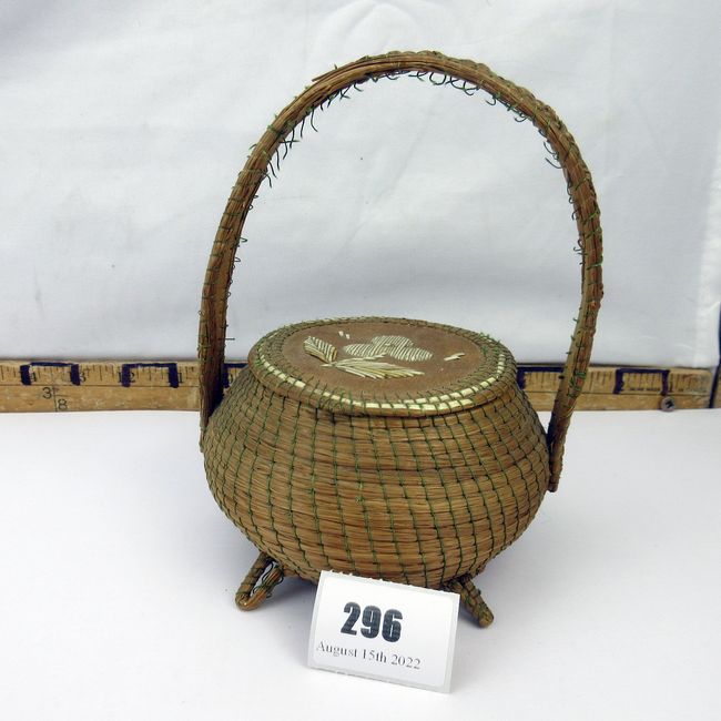 Current Bid: $31.99 [Refresh Price]YOU WILL NEED TO REFRESH THIS PAGE TO SEE UPDATED BID (Log in and this will update automatically) You must LOG IN or REGISTER to see this full page auction listing and bid. Auction is Over Winning Bid Amount: $31.99 **Lot Details: (296s) - A vintage handcrafted First Nations sweet grass, birchbark and porcupine quill basket. A rare piece to find in basket form. Slight wear to handle from carrying, and scent of pipe tobacco. An excellent example with no missing quills. Log in to add this lot to your watch list or place a bid |