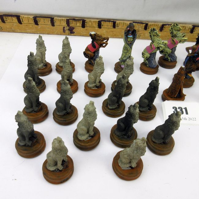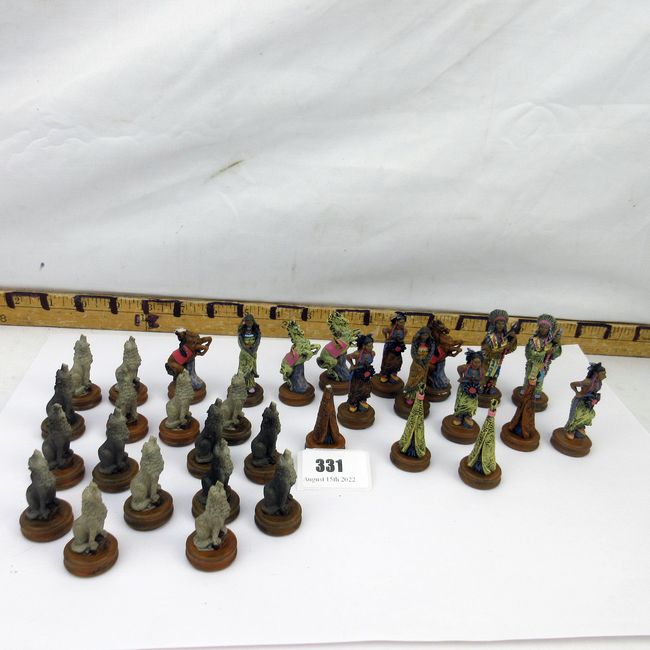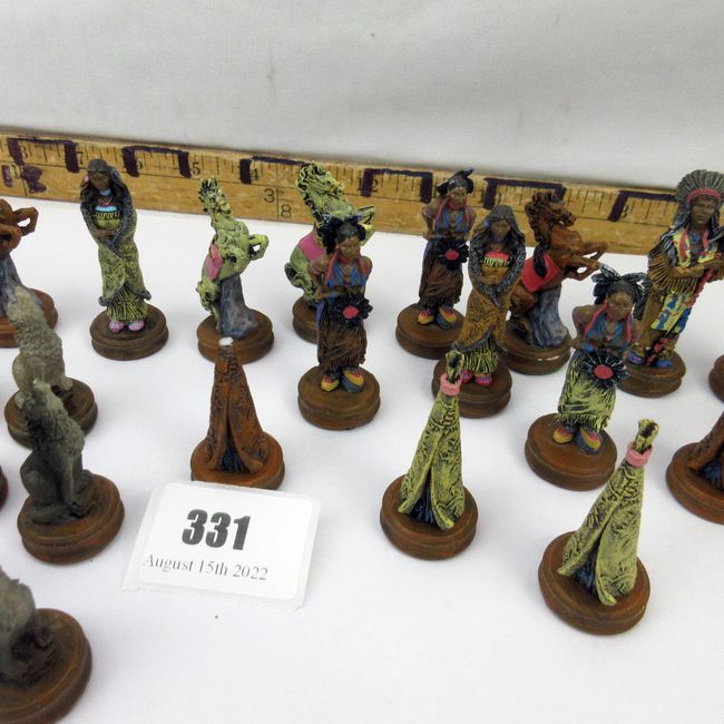 Current Bid: $5.00 [Refresh Price]YOU WILL NEED TO REFRESH THIS PAGE TO SEE UPDATED BID (Log in and this will update automatically) You must LOG IN or REGISTER to see this full page auction listing and bid. Auction is Over Winning Bid Amount: $5.00 **Lot Details: (331s) - Complete set of Native Indigenous Peoples chess pieces. Includes all 32pcs, 5 have some damage or chips. Very nice looking set. Log in to add this lot to your watch list or place a bid |