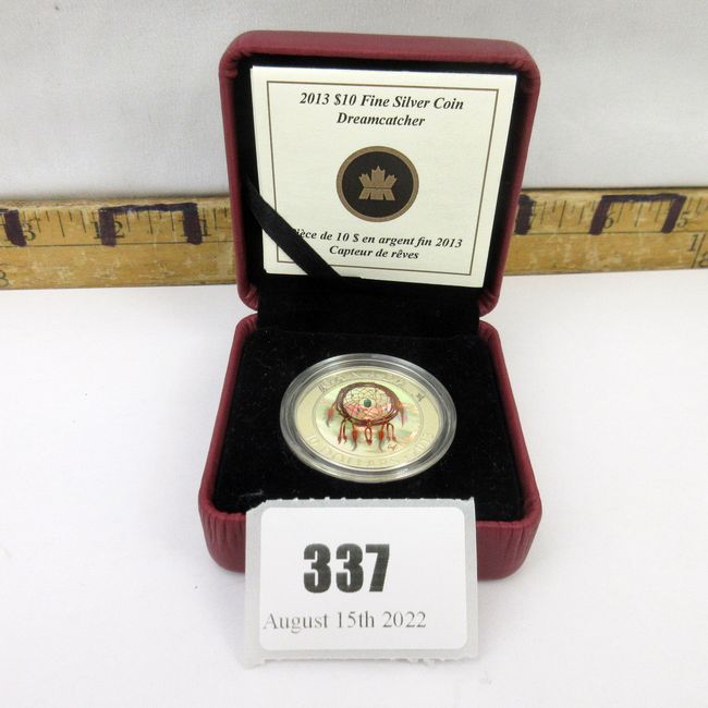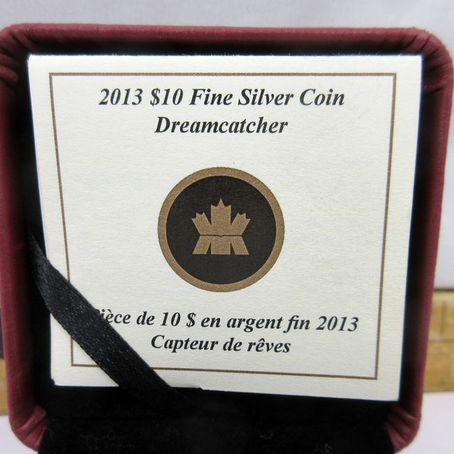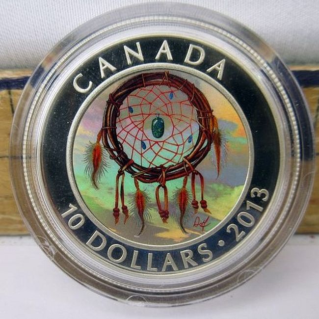 Current Bid: $72.00 [Refresh Price]YOU WILL NEED TO REFRESH THIS PAGE TO SEE UPDATED BID (Log in and this will update automatically) You must LOG IN or REGISTER to see this full page auction listing and bid. Auction is Over Winning Bid Amount: $72.00 **Lot Details: (337s) - Incredible Royal Canadian Mint 2013 Dreamcatcher hologram $10 Fine Silver Coin (99.99%) with presentation box and paperwork. Log in to add this lot to your watch list or place a bid |