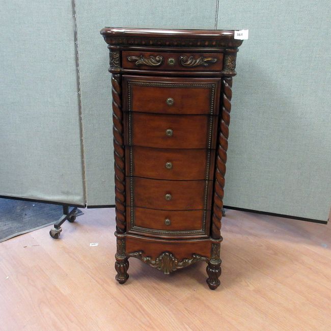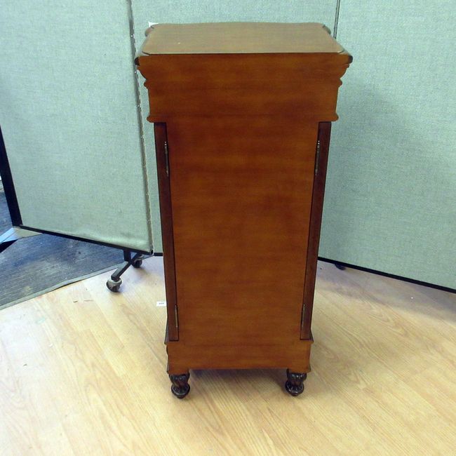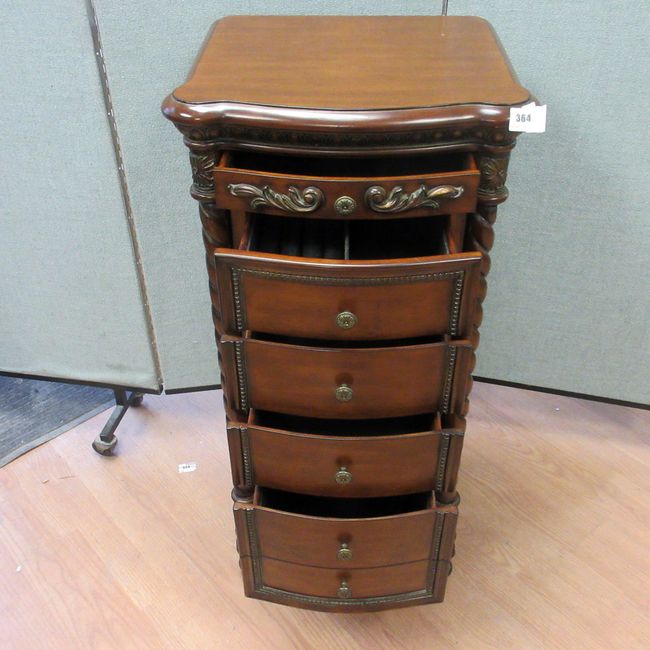 Current Bid: $127.00 [Refresh Price]YOU WILL NEED TO REFRESH THIS PAGE TO SEE UPDATED BID (Log in and this will update automatically) You must LOG IN or REGISTER to see this full page auction listing and bid. Auction is Over Winning Bid Amount: $127.00 **Lot Details: (364s) - Standing Jewelry Wood Cabinet Chest Swing Open Sides, 39" wide, closed wide 17", fluted top, scroll wood sides open, 5 drawers w 2 fitted rings etc, 37 3/4" high x 15" deep Log in to add this lot to your watch list or place a bid |