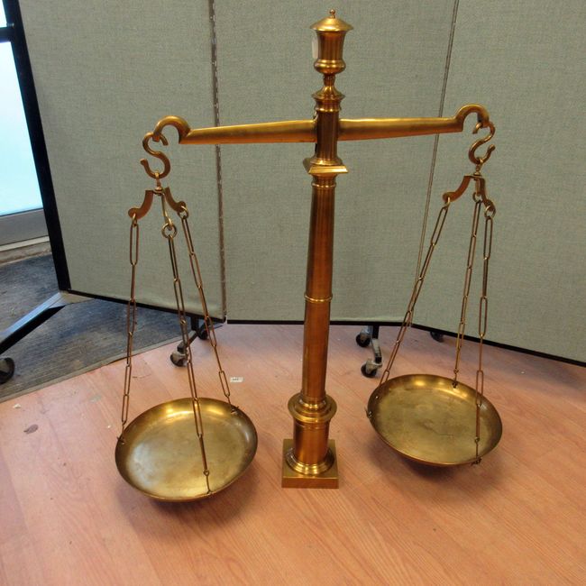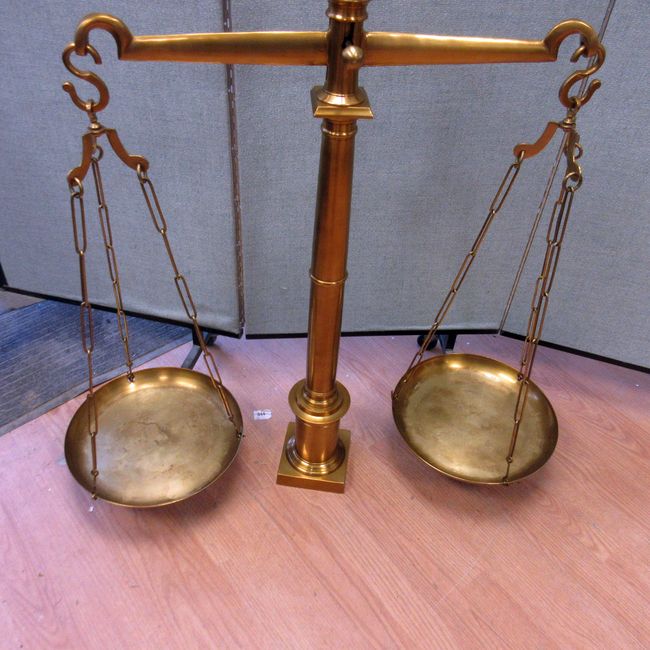 Current Bid: $42.00 [Refresh Price]YOU WILL NEED TO REFRESH THIS PAGE TO SEE UPDATED BID (Log in and this will update automatically) You must LOG IN or REGISTER to see this full page auction listing and bid. Auction is Over Winning Bid Amount: $42.00 **Lot Details: (367s) - Solid BRASS HUGE 38 LBs Balance Scales Justice Scales, easily dismantled, 42" high x 39" wide (bottom base is 5 1/2" square for security), well made, totally awesome scale ! Log in to add this lot to your watch list or place a bid |