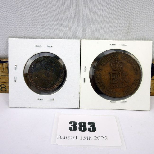Current Bid: $9.77 [Refresh Price]YOU WILL NEED TO REFRESH THIS PAGE TO SEE UPDATED BID (Log in and this will update automatically) You must LOG IN or REGISTER to see this full page auction listing and bid. Auction is Over Winning Bid Amount: $9.77 **Lot Details: (383s) - 2 commemorative medallions, 1939 royal visit token, 1953 Coronation commemorative Log in to add this lot to your watch list or place a bid |