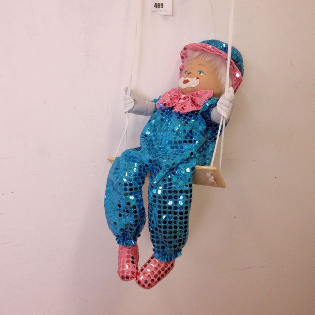 Current Bid: $[Refresh Price]YOU WILL NEED TO REFRESH THIS PAGE TO SEE UPDATED BID (Log in and this will update automatically) You must LOG IN or REGISTER to see this full page auction listing and bid. Auction is Over Winning Bid Amount: $This item did not sell **Lot Details: (409s) - Hand painted and hand crafted clown on swing Log in to add this lot to your watch list or place a bid |