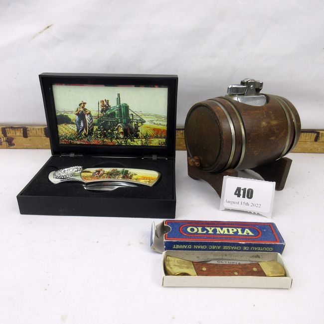 Current Bid: $19.00 [Refresh Price]YOU WILL NEED TO REFRESH THIS PAGE TO SEE UPDATED BID (Log in and this will update automatically) You must LOG IN or REGISTER to see this full page auction listing and bid. Auction is Over Winning Bid Amount: $19.00 **Lot Details: (410s) - Vintage wooden barrel lighter and 2 folding pocket knives. Lighter needs new flint Log in to add this lot to your watch list or place a bid |