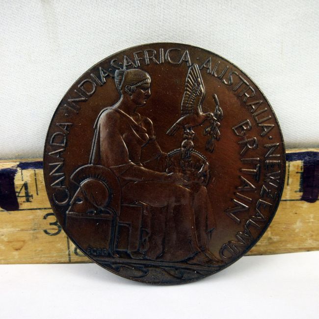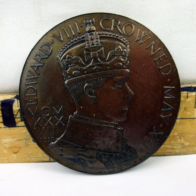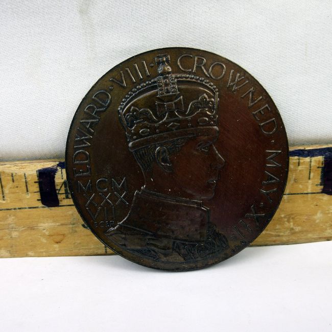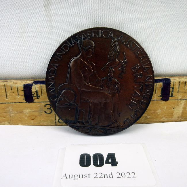 Current Bid: $16.00 [Refresh Price]YOU WILL NEED TO REFRESH THIS PAGE TO SEE UPDATED BID (Log in and this will update automatically) You must LOG IN or REGISTER to see this full page auction listing and bid. Auction is Over Winning Bid Amount: $16.00 **Lot Details: (4t) - Great Britain, very large, rare bronze medal, 1937 to commemorate the Coronation of Edward VIII. Instead Edward VIII abdicated the thrown t marry Wallace Simpson. Reverse seated Britannia with Dove. Bronze medal is 57mm across and 4.8mm thick. Log in to add this lot to your watch list or place a bid |